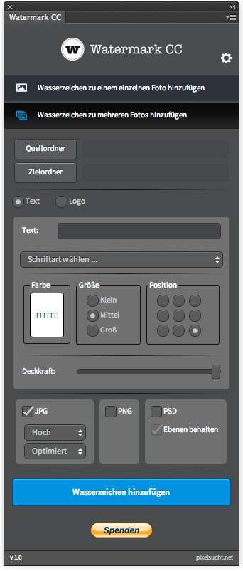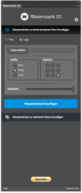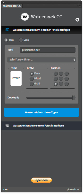 Übrigens: Einige von euch werden die Funktionen von „Watermark CC“ schon kennen. Nämlich von meinem anderen Panel „Sharpen4Web CC“. Hier gibt es seit Version 1.5 – neben der Verkleinerung und Schärfung eines Fotos – auch die Möglichkeit eine Signatur/Wasserzeichen hinzuzufügen.