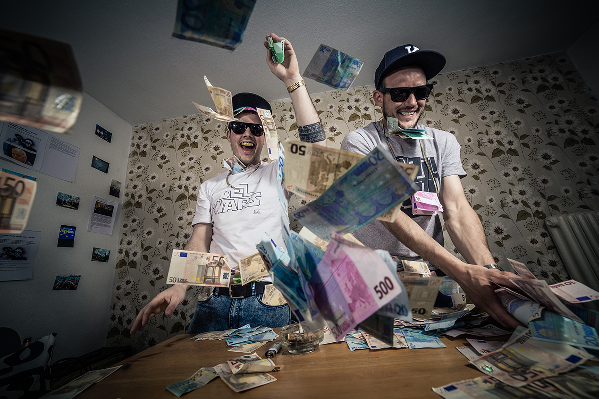 Bei einem solchen Shooting sind vor allem Requisiten wichtig (in unseram Fall die Geldscheine, die Goldzähne, Brille usw.). Auch das habe ich ein paar Tage vorher mit den Rappern abgesprochen. Erfeulicherweise hatten sie jede Menge zur Verfügung und brachten es zum Shooting mit.